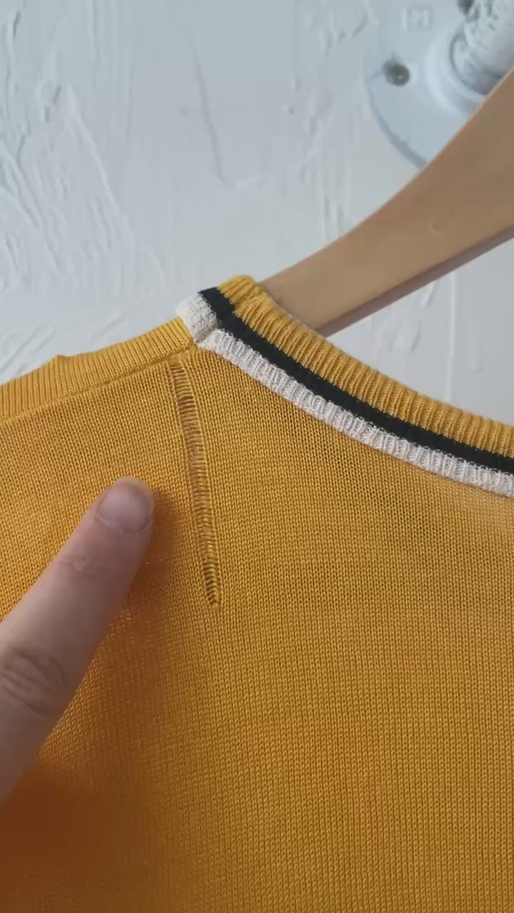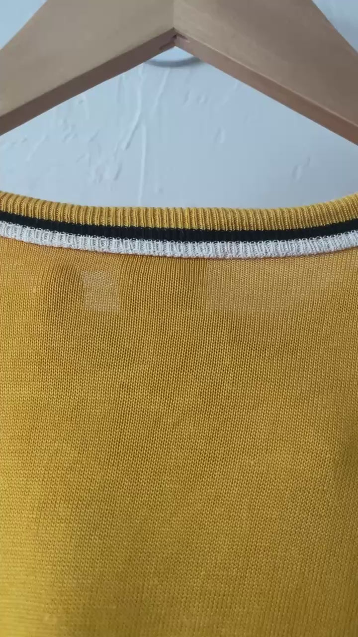 Vintage black and yellow thrashed jersey with "13" stitched on the back. Beautifully thrashed and worn, details noted in photos. Would be cute styled up or down. A thicker jersey with ribbed cuffs and and collar.