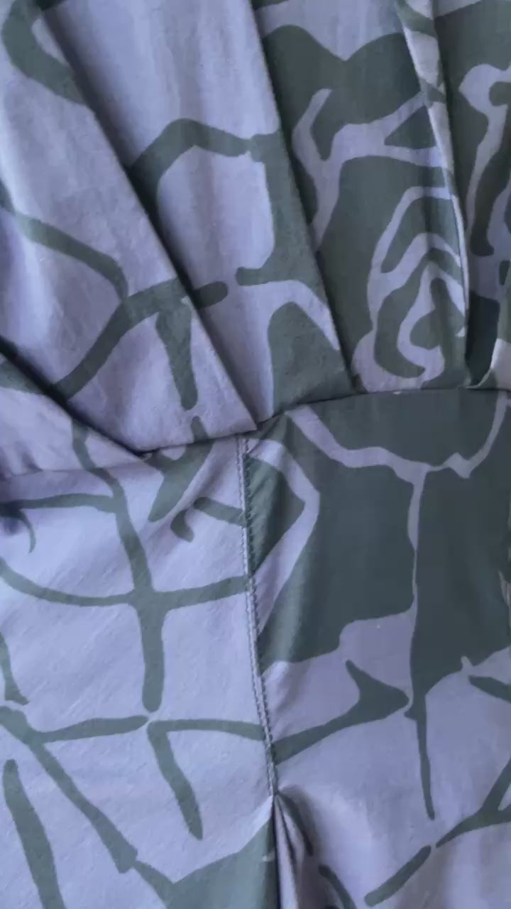 Vintage Alberta Ferretti occassional midi dress in purple periwinkle rose print juxtaposed with a sheer blue fabric at sleeves and back. The tension between these two fabrics is the perfect balance of tailored and delicate. Such a unique deisgn - features an open back in main fabric, which is only covered by the sheer indigo fabric that is also used at sleeves and collar. Incredible pleating around the waistband, a plunging neckline, and sweet fabric-covered buttons at the cuffs. Includes a lapped zipper down the center back. Unfortunately, no pockets. In amazing vintage condition - no signs of holes or stains.