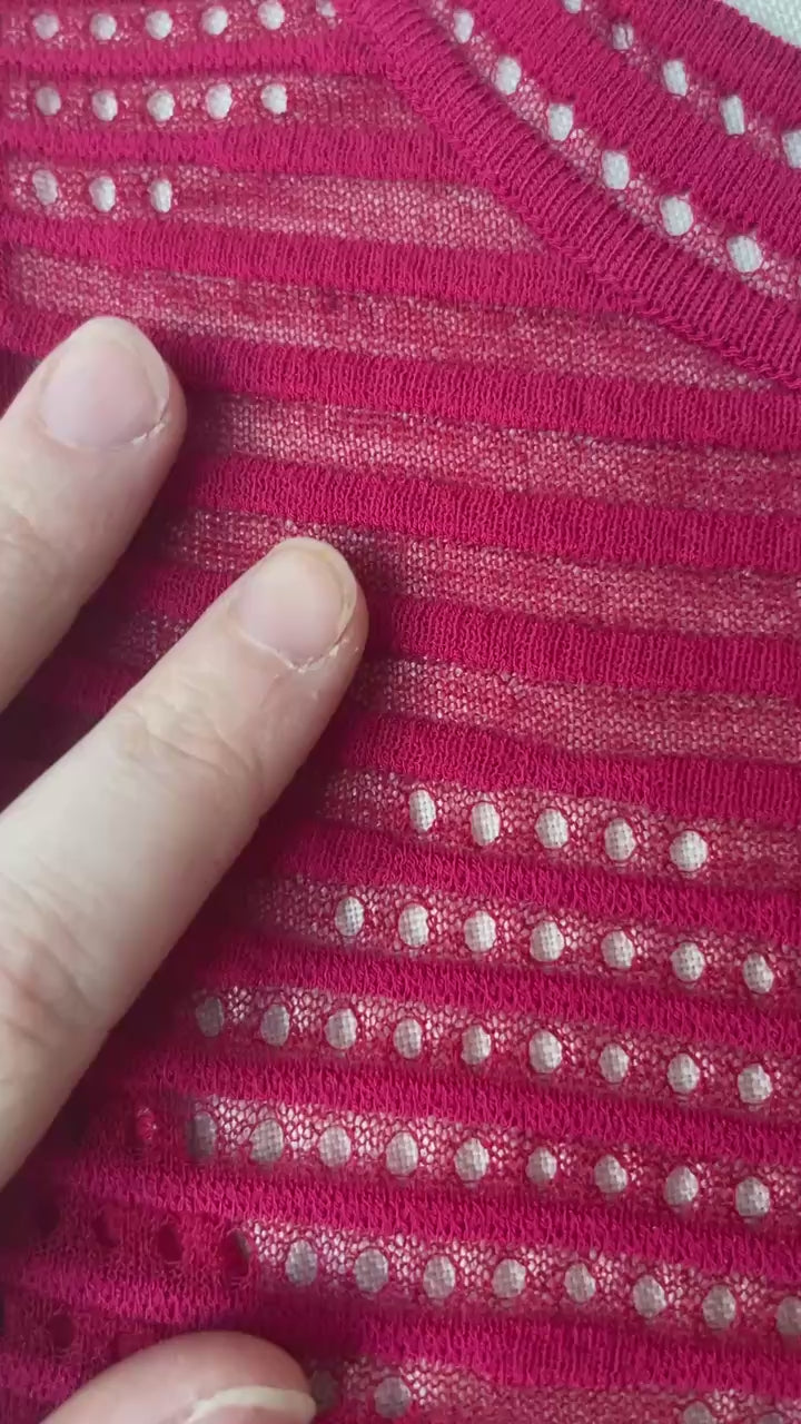 Beautiful sheer red knit dress from texture knitwear designer, Missoni. Features a ribbed waistband, a-line skirt, and flattering chevron-pattern. Comes with a matching red jersey slipdress, attached to the shoulder seams. In amazing condition - no signs of holes or stains.